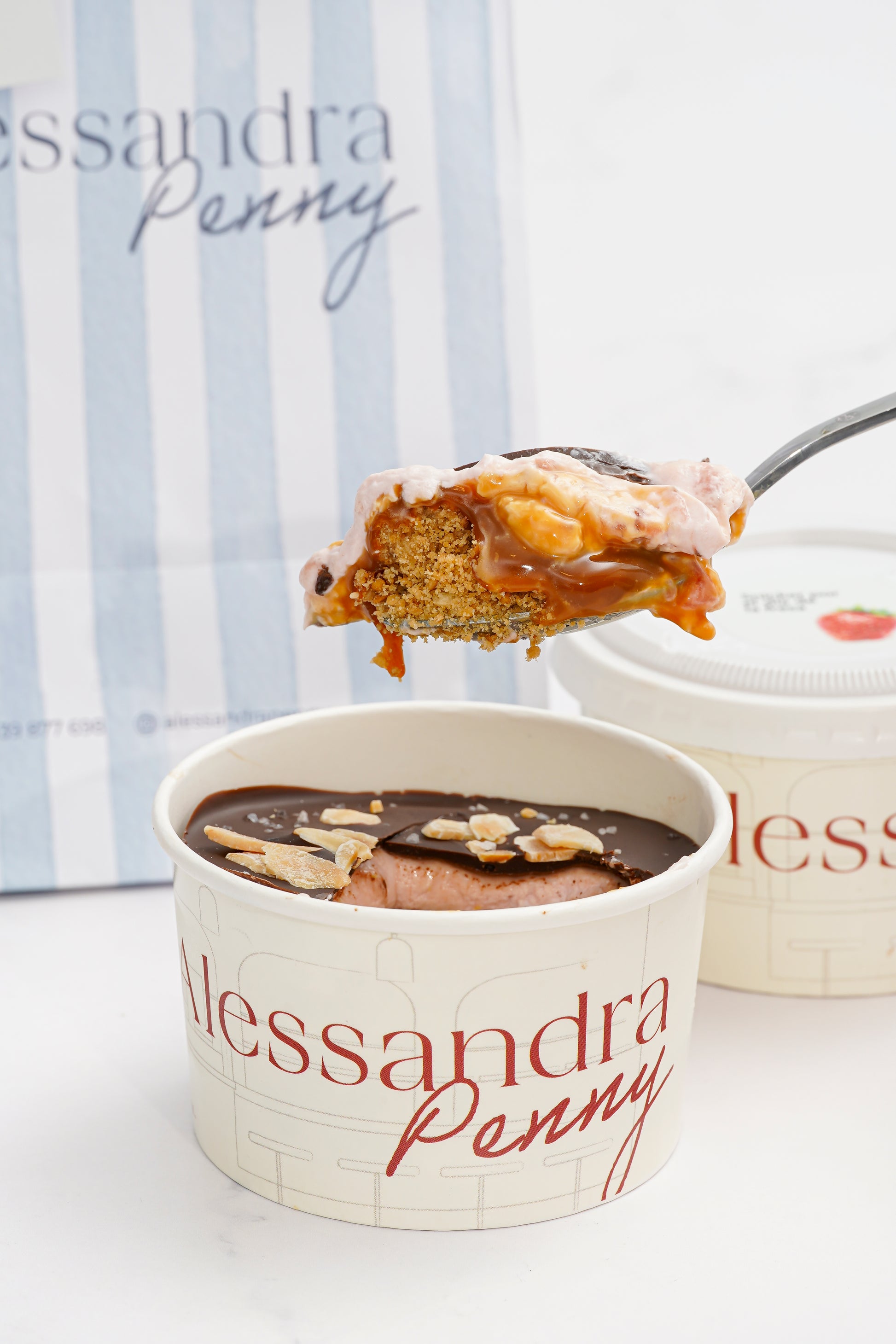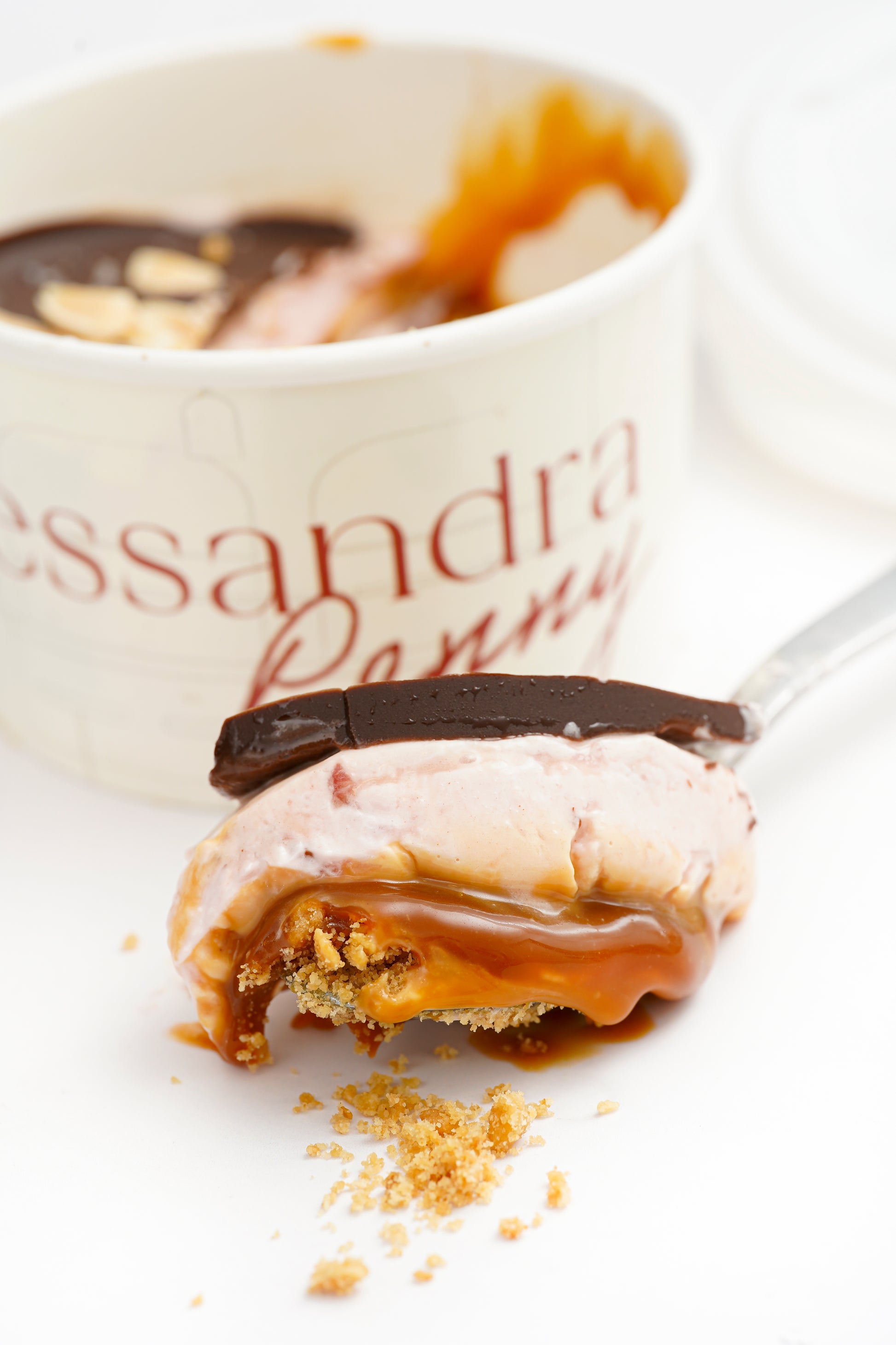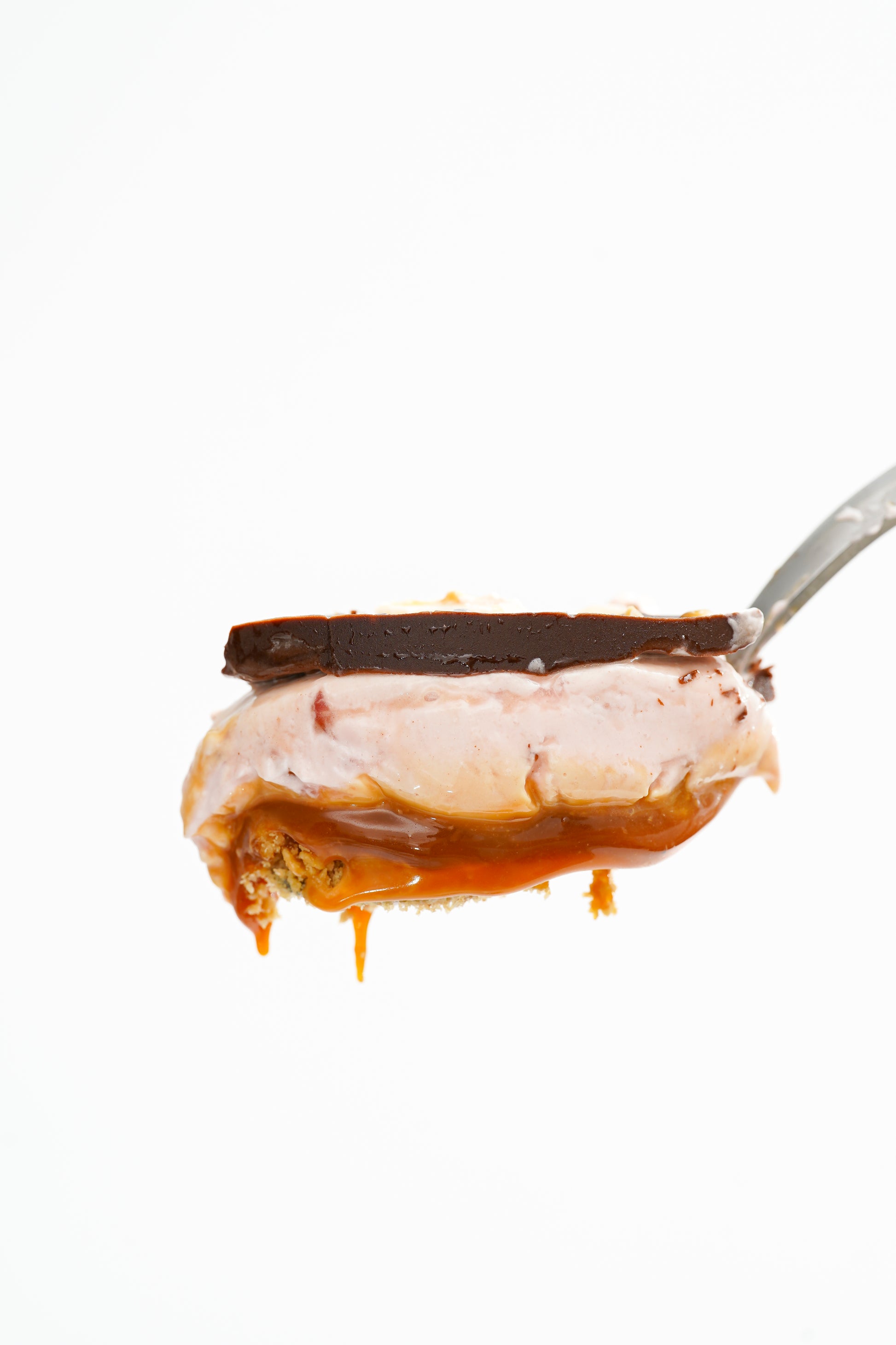 Base de galleta, caramelo, crema de fresas y chocolate bitter, decorado con almendras tostadas. Una combinación de texturas y sabores. Recomendamos comerlo súper frío.