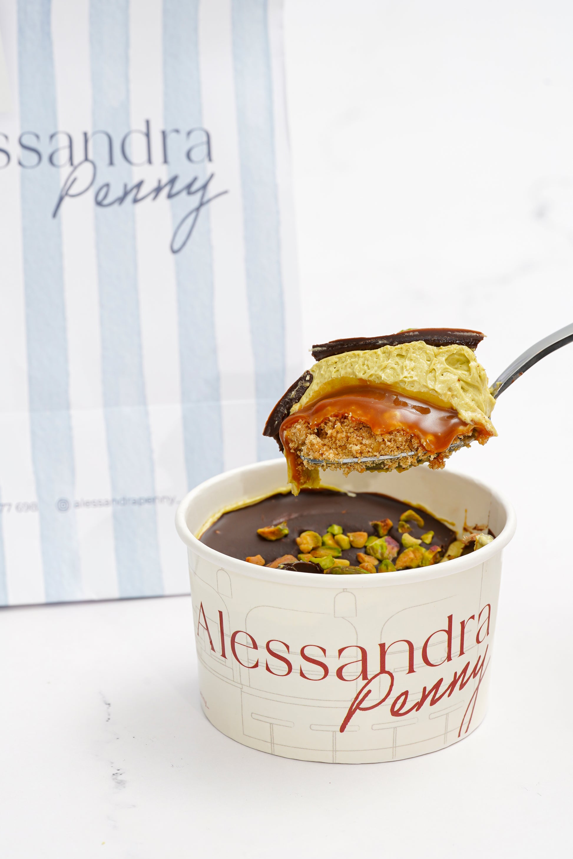 Base de galleta, caramelo, crema de pistacho y chocolate bitter. Una combinación de texturas y sabores. Recomendamos comerlo súper frío.