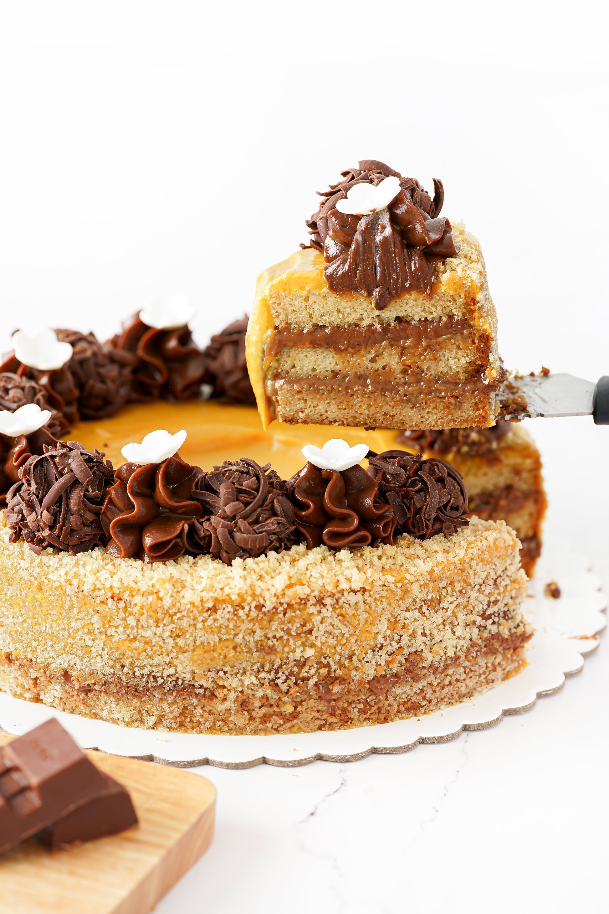 Torta húmeda de vainilla rellena de fudge de olla, con centro de manjarblanco de lucuma.